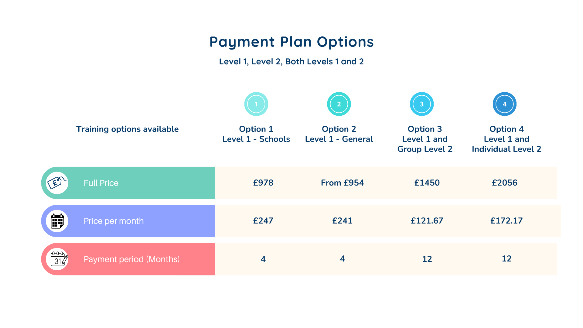 Or, combine Level 1 and Level 2 training and spread the cost over 12 months, giving you a discounted rate and smaller, more manageable payments.